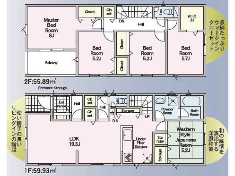 | 間取り | 5LDK/1階 19.3LDK・5.2和 / 2階 8洋・5.2洋・5.2洋・5.7洋 |