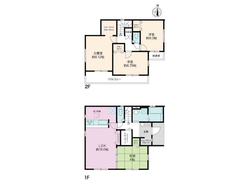 | 間取り | 4LDK/1階 16LDK・6和 / 2階 8.12洋・6.75洋・6洋 |